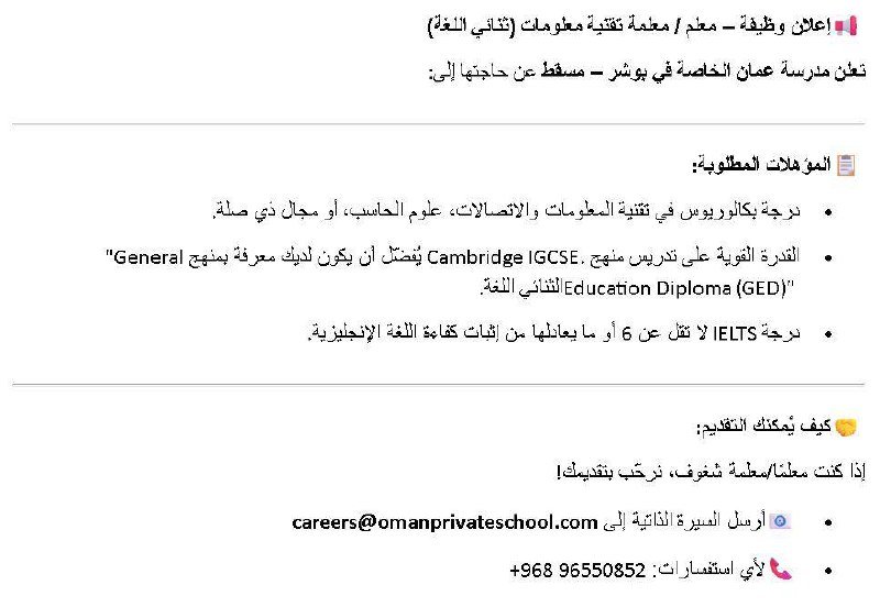 وظائف تدريس بسلطنة عمان اليوم لدى مدرسة عمان الخاصة ببوشر – مسقط، لتخصص تقنية المعلومات. الفرصة متاحة للمواطنين والأجانب من أصحاب الخبرات الحديثة للانضمام إلى فريق تعليمي متميز.