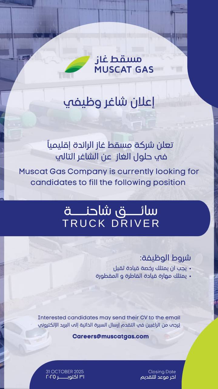عبر زلوم للتوظيف تعلن شركة مسقط غاز في سلطنة عمان وظيفة سائق شاحنة شاغرة لكافة الجنسيات وفق التالي: