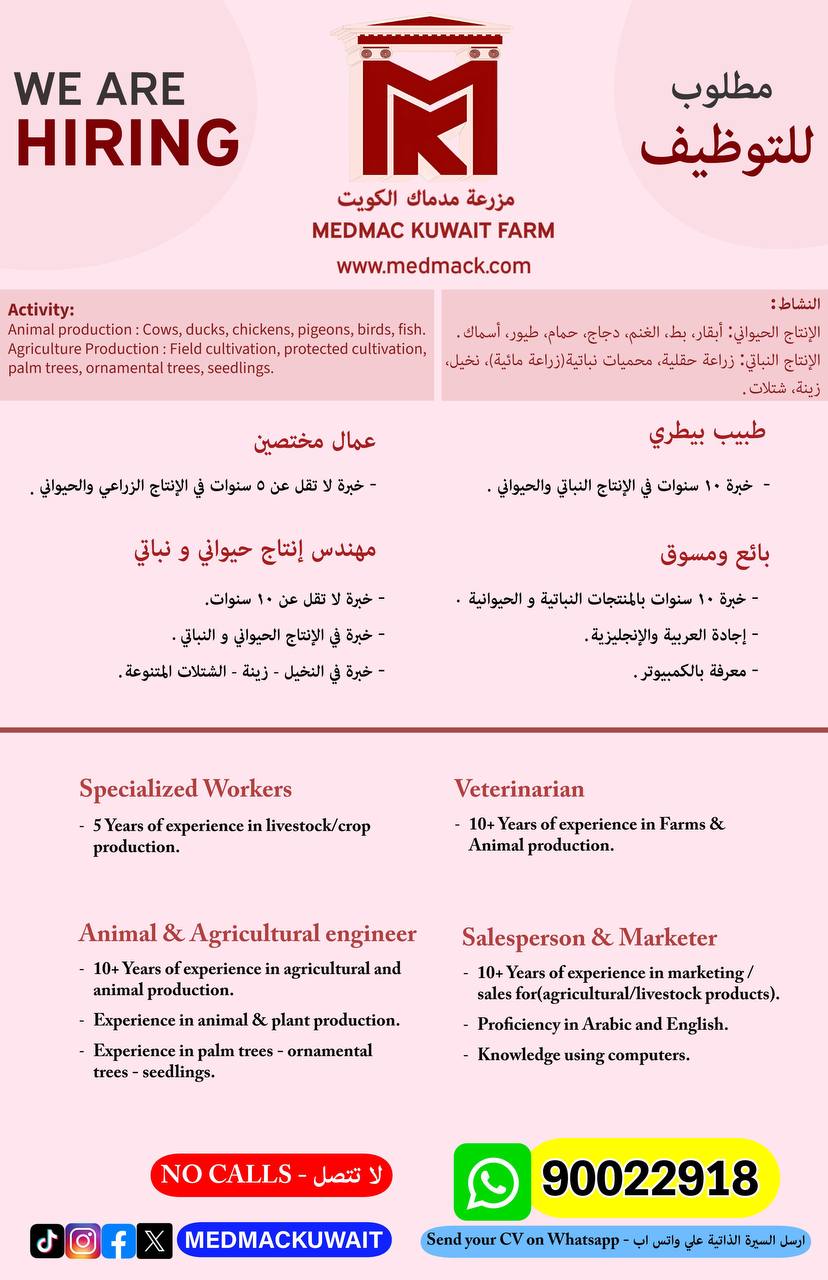 مطلوب موظفين وموظفات للعمل في مزرعة مدماك الكويت وفق التفاصيل التالية: