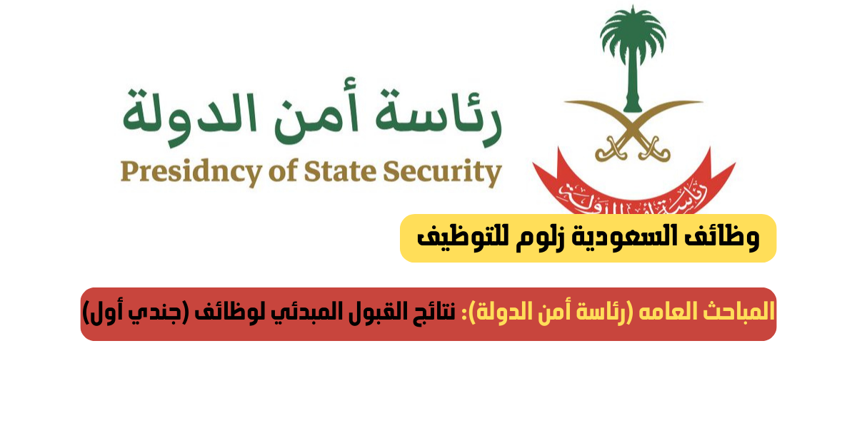 من خلال موقع زلوم للتوظيف نقدم لكم اعلان رئاسة أمن الدولة عن نتائج القبول المبدئي للوظائف العسكرية للمتقدمين على رتبة (جندي أول) وفق الاتي: