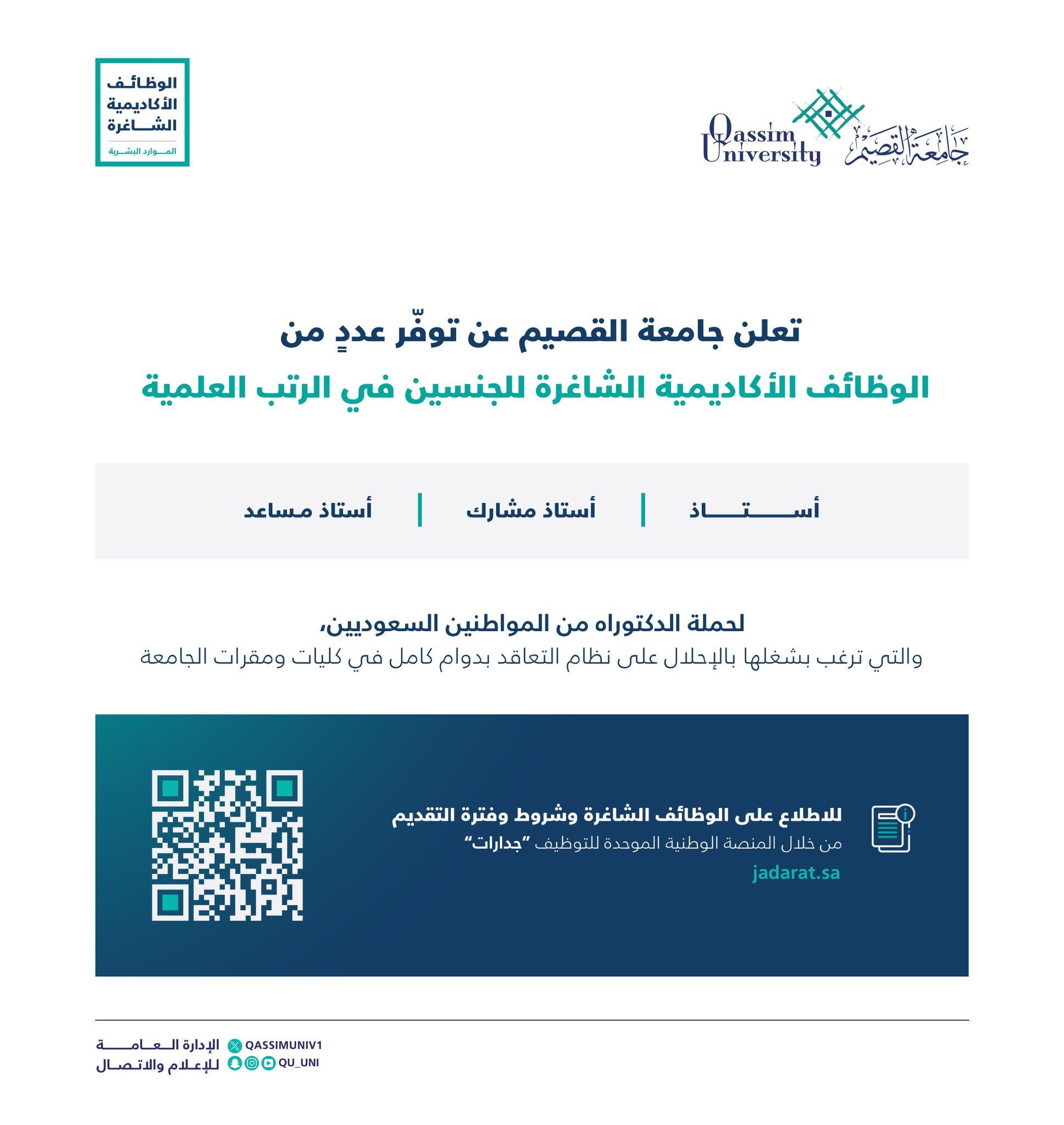 اعلنت جامعة القصيم عن فتح باب التقديم على عدد من الوظائف الأكاديمية الشاغرة بنظام التعاقد، متاحة للرجال والنساء من حملة الدكتوراه من المواطنين السعوديين، وذلك في مختلف الكليات وفروع الجامعة، على مراتب أستاذ، أستاذ مشارك، وأستاذ مساعد وفق الشروط أدناه.