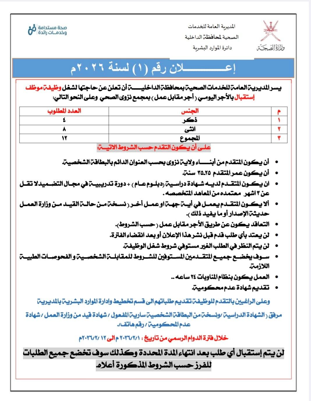 على الراغبين في التقديم لوظائف المديرية العامة للخدمات الصحية بمحافظة الداخلية التوجه إلى قسم تخطيط وإدارة الموارد البشرية بالمديرية خلال أوقات الدوام الرسمي.